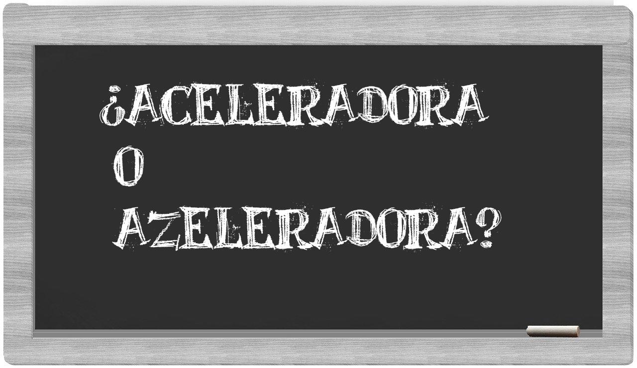En la situación específica que involucra las expresiones aceleradora y azeleradora, no deberías titubear ni un instante, pues únicamente aceleradora se presenta de manera adecuada. Por otro lado, azeleradora carece de presencia en el Diccionario de la Real Academia Española.