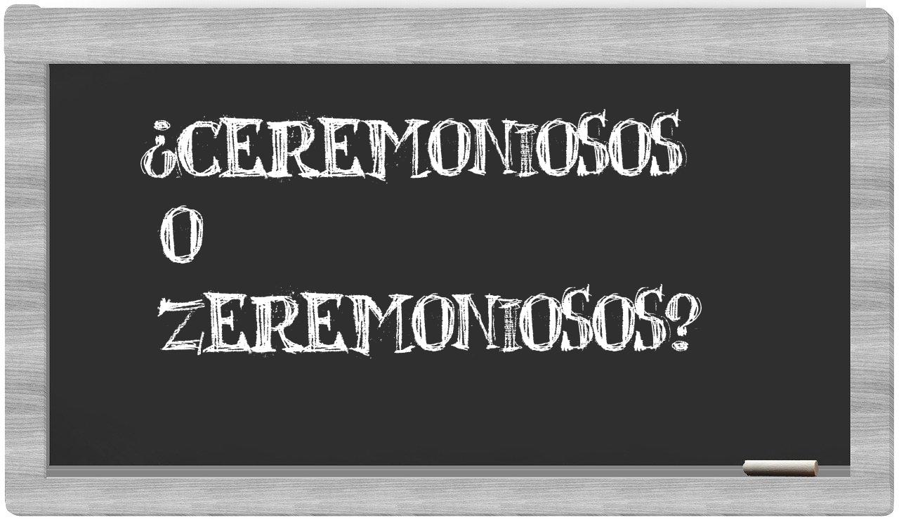 Cuando se trata de las palabras ceremoniosos y zeremoniosos, nunca deberías tener incertidumbres, pues únicamente ceremoniosos es la que ocupa el lugar correcto en nuestro lenguaje, ya que zeremoniosos no se encuentra en el prestigioso Diccionario de la Real Academia Española.