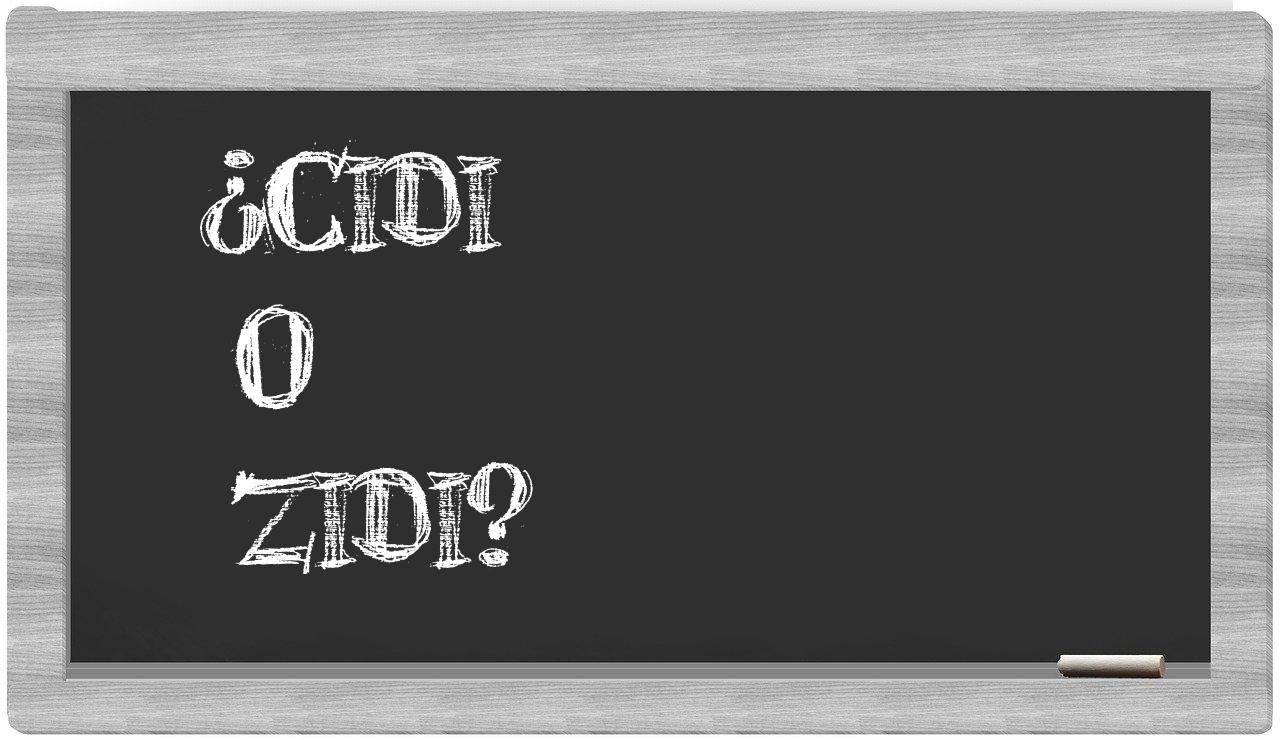 Cuando se presenta la elección entre cidi y zidi, no hay motivo para titubear, puesto que únicamente cidi se encuentra registrada adecuadamente. Por su parte, zidi no figura en el Diccionario de la Real Academia Española.
