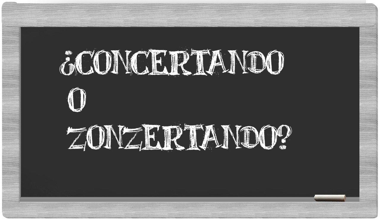 En la situación particular que involucra las expresiones concertando y zonzertando, no deberías titubear, puesto que únicamente concertando se encuentra correctamente redactada. Por otro lado, zonzertando no figura en el Diccionario de la Real Academia Española.