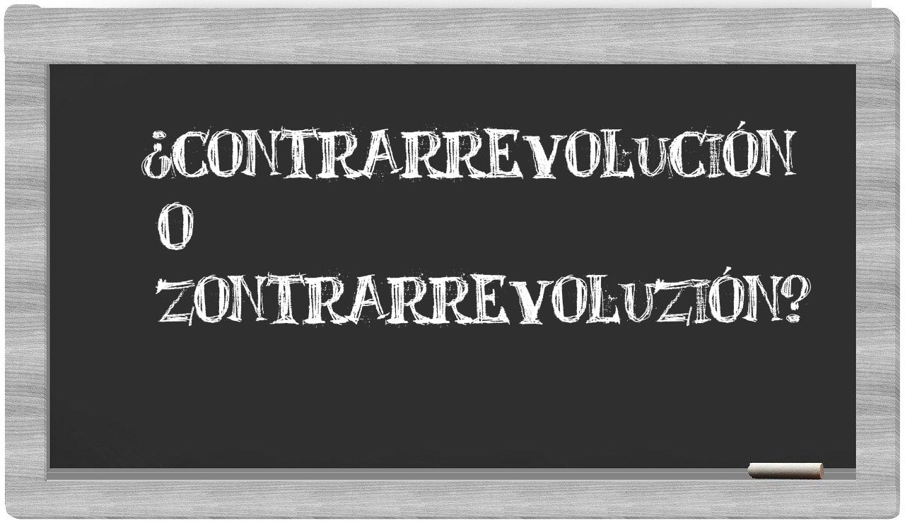 Cuando se presente la elección entre contrarrevolución y zontrarrevoluzión, no caben dudas en tu decisión, puesto que únicamente contrarrevolución es la forma correcta de escribirlo. La palabra zontrarrevoluzión no figura en el Diccionario de la Real Academia Española.