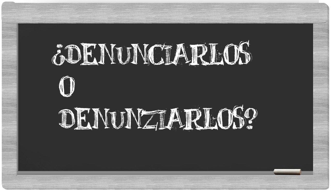 Cuando se trata de las palabras denunciarlos y denunziarlos, no hay motivo para titubear, puesto que únicamente denunciarlos se encuentra debidamente reflejada en el Diccionario de la Real Academia Española, mientras que denunziarlos carece de reconocimiento oficial.