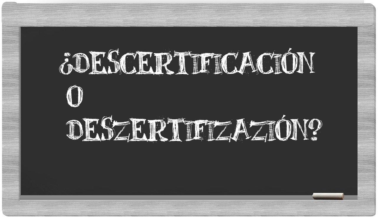 Cuando se trata de la elección entre descertificación y deszertifizazión, no hay lugar para la incertidumbre, puesto que solo descertificación es la forma adecuada. Por otro lado, deszertifizazión no se encuentra registrada en el Diccionario de la Real Academia Española.