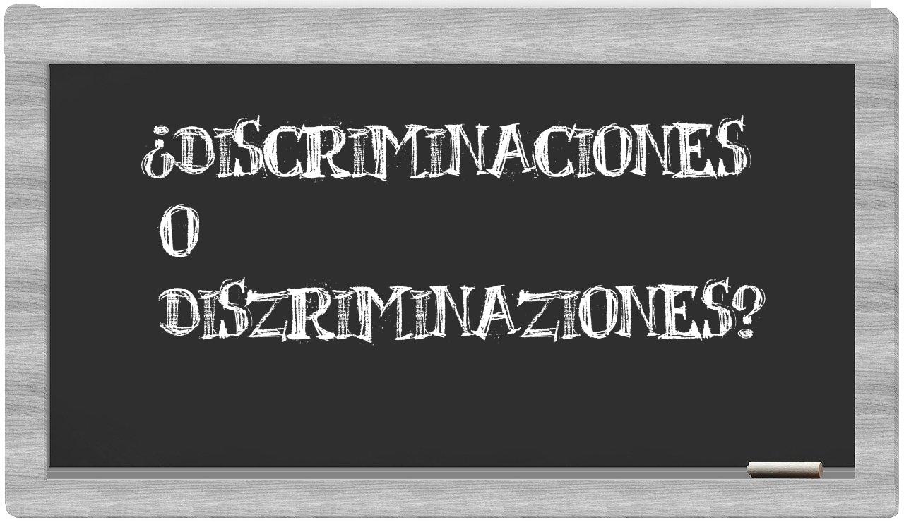 Cuando te enfrentes a la elección entre discriminaciones y diszriminaziones, te animo a que no vaciles, puesto que únicamente discriminaciones es la que se encuentra correctamente registrada. En cambio, diszriminaziones no figura en el Diccionario de la Real Academia Española.