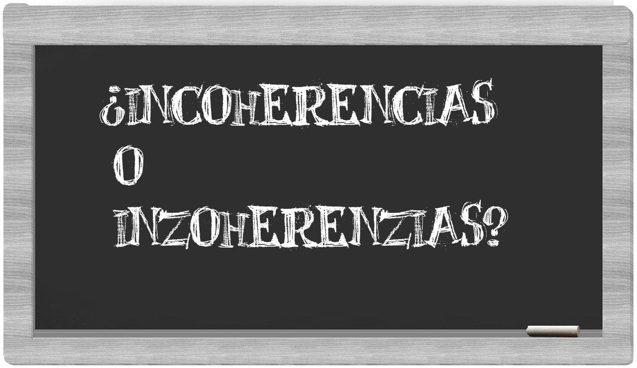 A la hora de elegir entre incoherencias y inzoherenzias, es fundamental no vacilar, puesto que únicamente incoherencias se encuentra correctamente formulada. Por otra parte, inzoherenzias no figura en el Diccionario de la Real Academia Española.