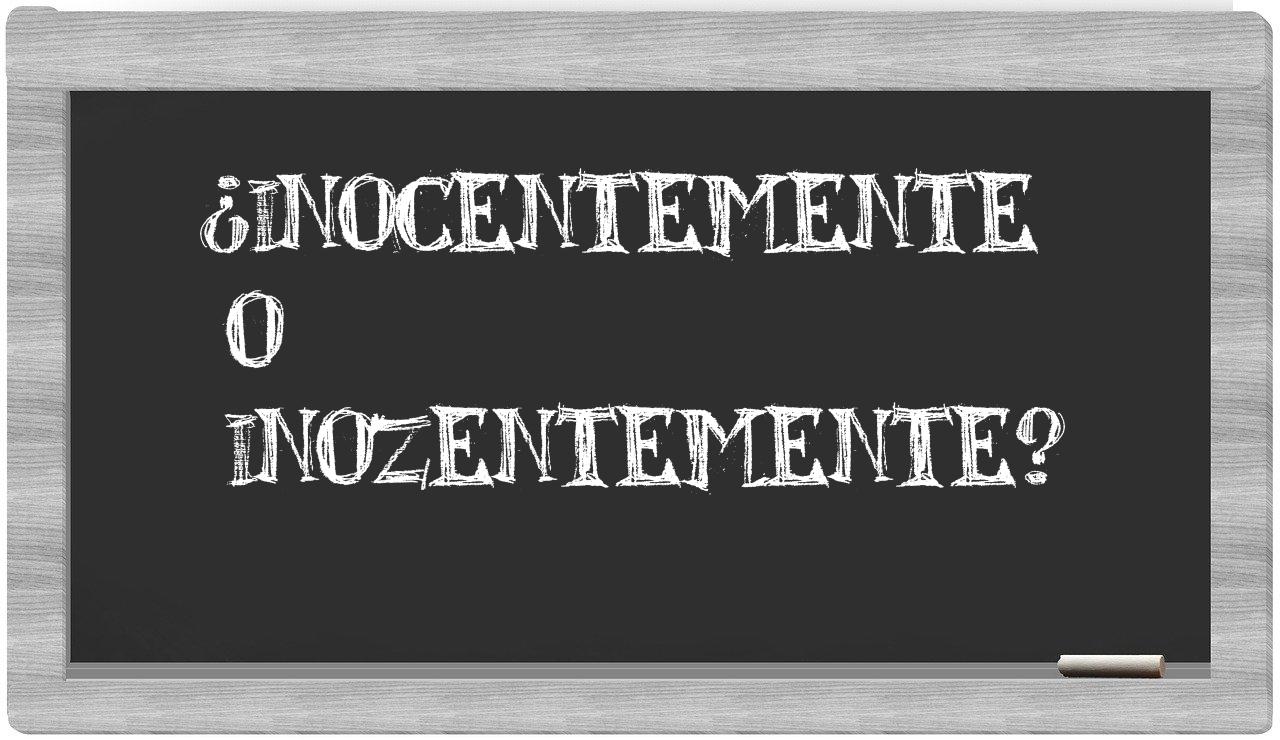 En la situación específica que involucra los términos inocentemente y inozentemente, nunca deberías contemplar una incertidumbre, puesto que únicamente inocentemente se encuentra correctamente redactado. inozentemente carece de presencia en el léxico del Diccionario de la Real Academia de la Lengua.