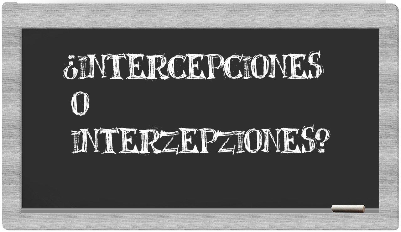 Cuando se presenta la comparación entre intercepciones y interzepziones, es fundamental estar seguros, porque únicamente intercepciones se halla correctamente escrita. Por otro lado, interzepziones no figura en el Diccionario de la Real Academia Española.