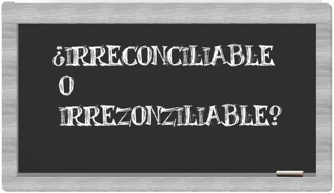 Cuando se presenta la elección entre irreconciliable y irrezonziliable, no cabe lugar a la incertidumbre, puesto que únicamente irreconciliable es la que se encuentra correctamente escrita; en cambio, irrezonziliable no tiene cabida en el Diccionario de la Real Academia Española.