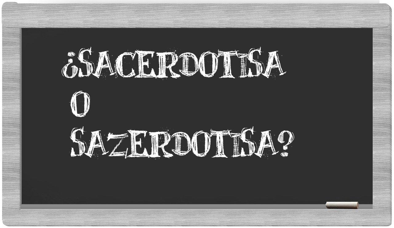 Cuando se presenta la disyuntiva entre sacerdotisa y sazerdotisa, la elección es clara y sin titubeos, porque únicamente sacerdotisa es la opción que se encuentra adecuadamente aceptada; sazerdotisa, en cambio, no figura en el prestigioso Diccionario de la Real Academia Española.