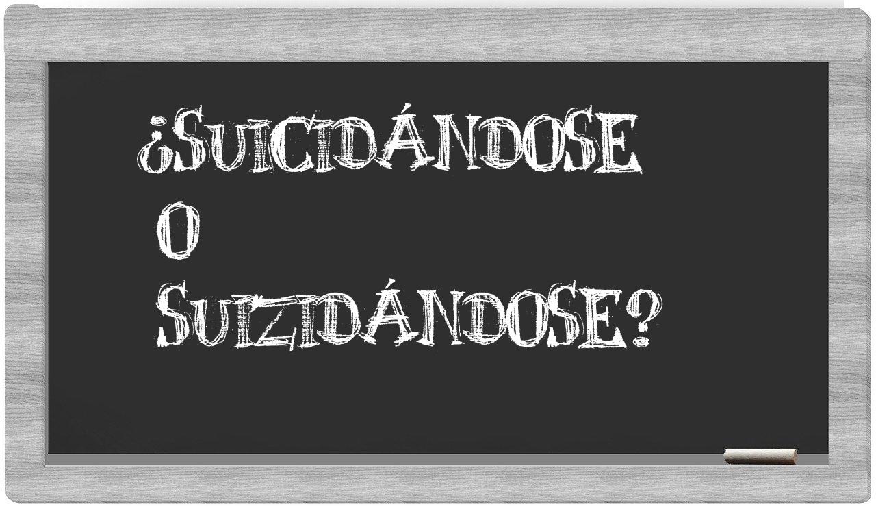 Cuando se presenta la comparación entre suicidándose y suizidándose, es importante que no vaciles, puesto que únicamente suicidándose se encuentra correctamente redactada. Por otro lado, suizidándose ni siquiera figura en el Diccionario de la Real Academia Española.